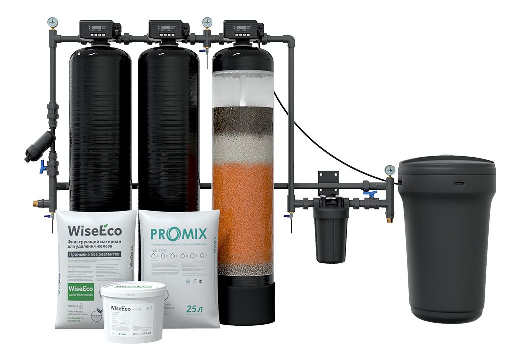 В состав оборудования входит: латунный грязевой фильтр, бесшумная аэрационная колонна типа Oxidizer, автоматический безреагентный фильтр-обезжелезиватель, автоматический универсальный фильтр с баком для соли, манометры, термочехлы, все необходимые фильтрующие загрузки. Комплексная система VKXO работает на эксклюзивных клапанах управления SCA19 (производство Франция), без подключения к электрической сети (на батарейках). Благодаря использованию современных технологий и материалов, а также безупречному качеству сборки, эти русифицированные блоки управления являются гарантом безупречной работы фильтров. Корпуса Canature, используемые в оборудовании, изготовлены из пищевого пластика. Система комплектуется неопреновыми термочехлами, которые предназначены для теплоизоляции и предотвращения образования конденсата на поверхности корпусов фильтров. Система изготавливается на собственных производственных мощностях. Состав системы: Запатентованная система бесшумной аэрации (технология Oxidizer) без применения компрессора позволяет интенсивно насыщать воду кислородом воздуха и интенсифицировать процессы окисления растворенного железа. Регенерация установки (заполнение кислородом) производится в автоматическом режиме с помощью управляющего клапана SCA19 (Франция) по сигналу с внешнего устройства (безреагентный фильтр). Грязевик (размер пор ячеек 500 мкм) предназначен для защиты автоматики водоочистного оборудования от крупнодисперсных взвешенных частиц (песок, трубная окалина и т.п.). Безреагентный фильтр-обезжелезиватель удаляет растворённое и нерастворённое в воде железо, марганец, органические примеси, снижает мутность воды. Регенерация фильтра не требует использования реагентных материалов и производится в автоматическом режиме с помощью управляющего клапана SCA19 (Франция). Универсальный фильтр с многофункциональной загрузкой ProMix предназначен для одновременного снижения содержания в воде ионов кальция и магния до рекомендуемого уровня 1,5-2,5 мг-экв/л, удаления железа, марганца, аммония и органических соединений природного происхождения. Регенерация фильтра производится в автоматическом режиме с помощью управляющего клапана SCA19 (Франция) по сигналу счётчика. Корпус фильтра и соляного бака, а также все контактирующие с водой элементы управления изготовлены из полимерных материалов пищевого класса. Для приготовления регенерационного раствора рекомендуется использовать таблетированную поваренную соль.