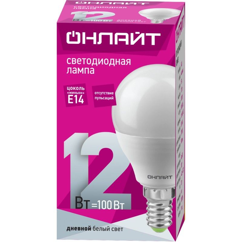 Читать все статьиЛампа ОНЛАЙТ 12Вт Е14 шар 6500К G45 90 062