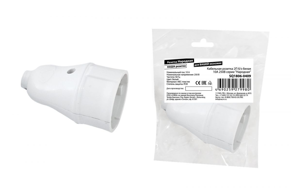 Кабельная розетка 2П б/з белая 10А 250B серии «Народная»