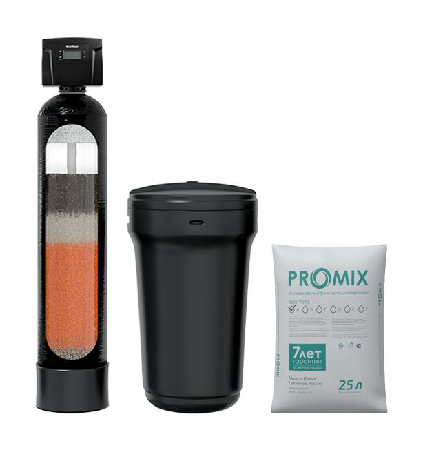 Система умягчения/обезжелезивания предназначена для комплексной очистки водопроводной и артезианской воды с одновременным умягчением, удалением железа, марганца, аммония и органических соединений природного происхождения. Применяется для защиты систем водоснабжения, водонагревательных приборов (в том числе стиральных и посудомоечных машин, водонагревателей и электрочайников) и уменьшения расхода моющих средств. В системе в качестве загрузки используется многофункциональный фильтрующий материал ProMix. Регенерация фильтра производится в автоматическом режиме с помощью электронного управляющего клапана Canature BNT по сигналу встроенного таймера или по сигналу счётчика. Для приготовления регенерационного раствора рекомендуется использовать таблетированную поваренную соль, производимую специально для этой цели. Корпуса Canature, используемые в оборудовании, изготовлены из пищевого пластика.